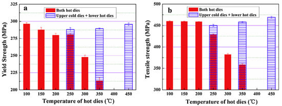 Relationship of mechanical properties on temperature of hot dies: (a) yield strength, (b) tensile strength [63].