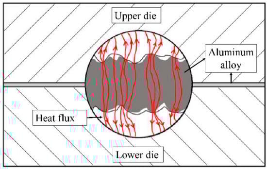 In the HFQ thermoforming process, the heat transfer phenomenon occurs in the contact between the heat-deformed aluminum alloy and the low-temperature mold; due to the radiation and convection heat loss to the surrounding air being negligible, the heat transfer from the alloy to the mold is mainly the heat conduction within the metal, due to the rough surface of the alloy and the mold, and the cavity is filled with air or other media, which results in the existence of an air gap between the alloy and the mold and hinders the heat transfer, as shown in Figure 6. Figure 6 demonstrates the microscopic morphology of the interface between the aluminum alloy and the die, hence the existence of thermal resistance. The condition of the contact surface between the alloy and the mold affects the heat transfer, different factors including contact pressure, surface roughness, surface lubrication, etc., affect the condition of the contact surface, such as the actual contact area, gap thermal conductivity, etc., which ultimately affects the thermal resistance, and thus the interfacial heat transfer coefficient (IHTC). The IHTC reflects the heat transfer efficiency between the mold and the alloy sheet. Ying et al. [69] investigated the transient heat transfer behavior of high-strength 7075-T6 alloy during the HFQ® process using a cylindrical mold model, with the microscopic morphology of the aluminum alloy–mold interface illustrated in Figure 14. Xiao et al. [70] observed that the IHTC of AA7075 increases with contact pressure, and lubrication significantly enhances heat transfer efficiency. However, when contact pressure is very low, in-die quenching performance deteriorates. Zhou et al. [71] developed a finite element model for aluminum alloy hot stamping, using a door impact side beam as an example. They combined a response surface model, sampling techniques, and a multiobjective genetic algorithm to optimize the process.