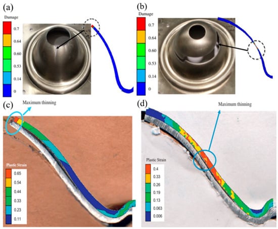 Experimental results and finite element formability simulations showing damage parameter contours of AA6082 plate deformed at 470 ± 10 °C. (a) Fast forming rate failure due to radial tearing of the center hole under 42 mm punch. (b) Slow forming rate failure due to circumferential tearing at mid-height position under 42 mm punch. (c) Comparison of finite element-simulated deformation profiles (including plastic strain profiles) with experimental deformed part cross-sections for fast forming rate under 32 mm punch and (d) slow forming rate under 32 mm punch [94].