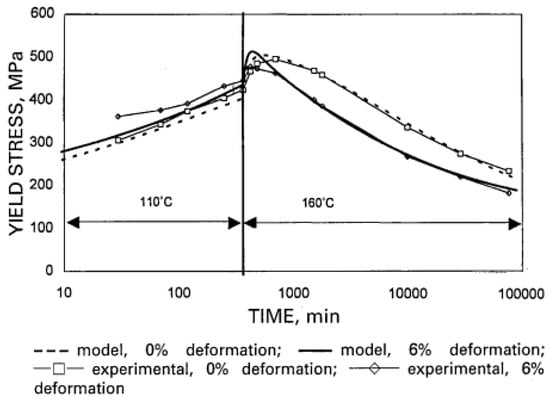 Shercliff and Ashby [101] established a pioneering model in 1990 to describe the age-hardening behavior of 2000-series aluminum alloys and 6000-series aluminum alloys. Their approach combined precipitation kinetics with microstructure–property relationships to systematically predict alloy yield strength. While this framework successfully explains the strengthening mechanisms in these alloy systems, the more complex precipitation behavior of 7000-series aluminum alloys necessitates additional model development to fully capture their aging response characteristics. Guyot et al. [102] conducted a comprehensive investigation of the age-hardening mechanisms in Al-Zn-Mg-Cu alloys, focusing on the temperature range for uniform η′ precipitation. Their study systematically correlated precipitation kinetics with mechanical properties and electrical conductivity, establishing quantitative relationships between microstructural evolution and mechanical performance. These findings provide fundamental insights into the age-hardening behavior of these alloys. For 7000-series aluminum alloys, optimal properties are typically achieved through a two-stage artificial aging process. This treatment enables the attainment of high strength while preserving adequate stress corrosion resistance, addressing the characteristic strength–corrosion trade-off in these alloys. In a two-step age-hardening study of 7475 aluminum alloy, Poole et al. [103] proposed a strength prediction model based on internal state variables, aiming at describing the effect of deformation on the aging kinetics. By introducing the contribution of precipitation strengthening and work hardening, the model also takes into account the evolution of the precipitate spacing and treats the non-isothermal aging process by the concept of “kinetic strength”. The model results are compared with the experimental measurements, as shown in Figure 18. The model predictions are in good agreement with the experimental results, especially near the peak strength and during the over-aging period, but there is a deviation from the experimental results during the initial aging stage, which the authors believe is related to the variation in the integral number of the precipitates and the choice of the contribution law to the flow stresses.