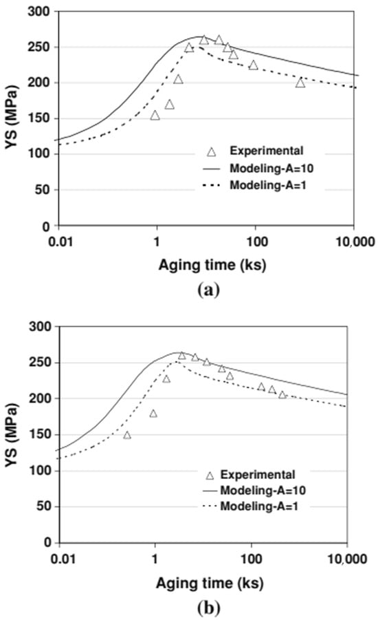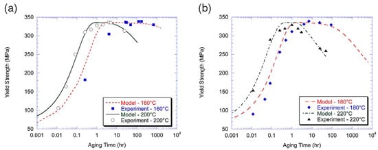 Comparison of the experimental and modeling results for the yield strength of solution-treated material using the strong obstacle assumption: (a) aging at 160 °C and 200 °C, (b) aging at 180 °C and 220 °C [106].