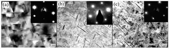 TEM images of alloy precipitates and corresponding diffraction points under different peak aging conditions: (a) 165 °C, 10 h; (b) 200 °C, 4 h; (c) 250 °C, 10 min [114].