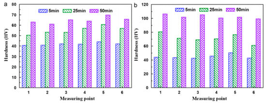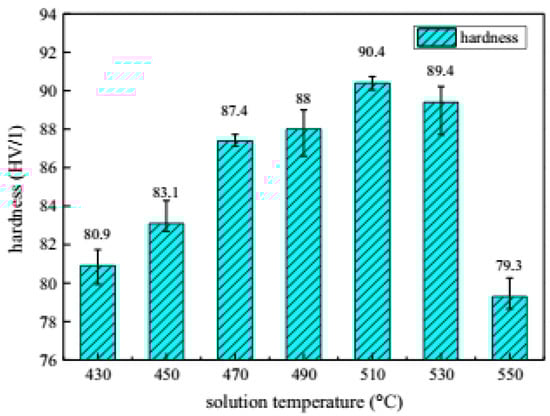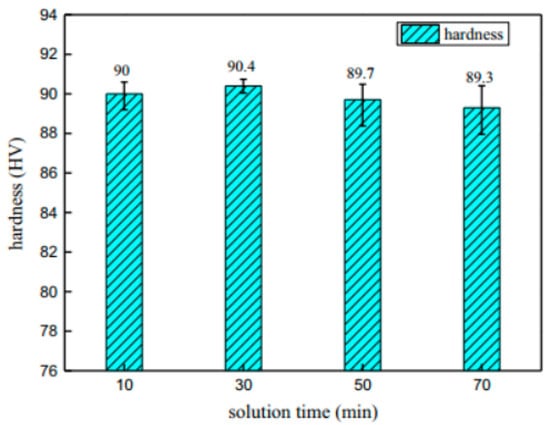 Garrett et al. [129] investigated the effect of solid solution time on the mechanical properties of AA6082 at different deformation rates. They found that increasing the proportion of solid solution time (defined as the duration at the solid solution temperature of 525 °C relative to the total solid solution time of 30 min) improves plasticity and reduces the maximum flow stress. When the solid solution time ratio reaches 0.66, further increases in solid solution time have minimal effects on the material’s mechanical properties, and initial anisotropy essentially disappears. Mrówka-Nowotnik et al. [130] studied the influence of solid solution heat-treatment temperature on the aging mechanism and kinetics of commercially deformed 6005 aluminum alloy. Their analysis revealed that the aging kinetics and hardness of 6005 aluminum alloy are generally independent of the solid solution heat-treatment temperature. Fan et al. [131] investigated the effect of different solid solution times (5 min, 25 min, and 50 min) on the hardness of a self-developed 6A02 aluminum alloy using the HFQ® process in a specialized device. As shown in Figure 27, the solid solubility of the alloy increases with the length of dissolution time, SEM analysis reveals the time-dependent dissolution of secondary phase particles during solution treatment. Initially (5 min), particles remain largely undissolved, distributed unevenly in the Al matrix (Figure 27a). With longer treatment (up to 50 min), progressive dissolution occurs (Figure 27b,c), demonstrating increasing solid solubility over time in the quenched condition. Reaching its highest value after 50 min. Figure 28 illustrates that the alloy hardness increases with the solid solution time at a temperature of 520 °C, peaking at approximately 70 HV after 50 min of solid solution treatment. Following aging treatment at 160 °C for 10 h, the hardness further increased to 106.5 HV. Ma et al. [132] also focused on solid solution temperature and time as key design variables and developed a response surface model to predict the ultimate tensile stress and ductility of the alloy. Their findings revealed that ultimate tensile stress increases while ductility decreases with higher solid solution heat-treatment (SHT) temperatures and longer times. These parameters were later optimized using the multiobjective sorting genetic algorithm (NSGA-II) to enhance both tensile strength and ductility. Liu et al. [133] investigated the effect of different solid solution temperatures and times on the strength of 7075 aluminum alloy sheets under the HFQ® process. They set the solid solution time to 30 min and observed changes in alloy hardness with varying solid solution temperatures. As shown in Figure 29, the maximum hardness of 90.4 HV was achieved at 510 °C. Subsequently, they compared the effect of different solid solution times on hardness at the optimal temperature of 510 °C, as illustrated in Figure 30. The results indicate that solid solution time has a less significant impact on hardness compared to temperature, with the peak hardness of 90.4 HV reached precisely at 30 min.