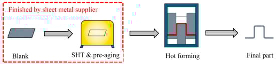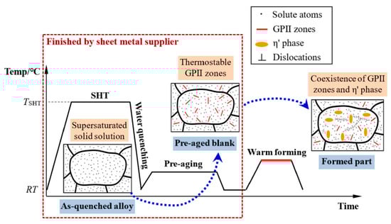 For this reason, Lin [41] from Imperial College, UK, first proposed an innovative integrated process combining heat treatment and hot forming for aluminum alloys, known as the HFQ® process. This method was initially tested for its feasibility on 2XXX, 6XXX, and 7XXX series aluminum alloys [42,43]. As shown in Figure 4, the fully solution-treated aluminum alloy sheet is rapidly transferred to a water-cooled die and immediately formed. The die remains closed to complete in-die quenching, after which the part undergoes aging treatment to achieve its final mechanical properties [44]. The deformation mechanism in this process primarily involves age hardening, where second-phase particles precipitate from the supersaturated solid solution as the alloy transitions from a single-phase to a two-phase region. This precipitation sequence follows the typical behavior observed in hot-stamped 7XXX-series aluminum alloys. For instance [45]: