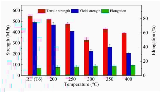 The cold–hot die combination offers distinct advantages in the forming process: heating the lower die prevents rapid temperature loss in the sheet, maintaining optimal formability, while the upper die’s rapid cooling ensures sufficient quenching rates to suppress coarse S-phase formation. This controlled thermal management promotes the precipitation of fine, uniformly distributed strengthening phases (50–100 nm) during subsequent aging, resulting in excellent mechanical properties. In contrast, the double hot die configuration suffers from significantly reduced cooling capacity due to excessive mold temperatures, which promotes the formation of coarse S-phase precipitates (750–1000 nm) during quenching and consequently diminishes material strength. The optimal mechanical properties were achieved at a mold temperature of 250 °C, with the material exhibiting a yield strength of 295.7 MPa and tensile strength of 469.2 MPa, as demonstrated in Figure 13. In addition, they further explored the effect of molding temperature (25–500 °C) on material properties based on Al-Mg-Si alloys, and found that peak hardness occurs at 200 °C and 500 °C, while good formability and strength can be obtained, which can be used as the applicable molding temperature [67]. Recent studies have also demonstrated that reducing the die gap improves the dimensional accuracy of Al-Cu-Mg alloy sheets in the hot forming–quenching integrated process. A smaller die clearance enhances heat transfer efficiency during quenching, enabling better control of temperature distribution and ensuring the alloy achieves peak age strengthening while maintaining high strength [68].