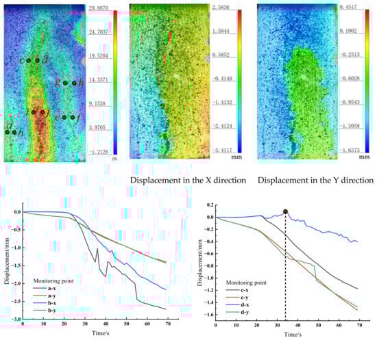 At e-f and g-h, symmetric horizontal displacement increases occurred. Post-43 s, displacement at e stabilized while f continued moving rightward, progressively widening the crack aperture. At g-h, displacement increased post-35 s due to synergistic crack propagation and central fissure effects. Vertical displacements remained synchronized at a-b, c-d, and e-f, confirming the absence of shear slip. At i-j, vertical displacements lagged horizontal movements by 15 s, reflecting slow normal-direction separation from rough fracture surfaces. Shear displacement emerged at g-h, coinciding with horizontal motion. Crack classification: Crack-a-b: Tension-dominated failure. Crack i-j → c-d: Transition from tension-shear composite to pure tensile failure. Crack e-f → g-h: Evolution from tension-dominated to tension-shear composite failure.