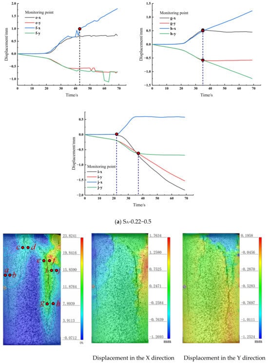 DIC observations of impact-compacted quartz sand specimens (SQ2-0.22–0.5) revealed downward shear-dominated crack propagation, generating multiple fracture surfaces with the highest principal strain localized at the upper-right corner. As shown in Figure 7b, four cracks developed in total—the highest among all specimens. Crack initiation began at c-d (48 s), where horizontal displacements decreased asymmetrically (c > d), inducing tensile opening. Subsequently, cracks formed at a-b, e-f, and i-j; e-f and i-j exhibited identical horizontal displacement growth rates along the x-axis, transitioning from crack nucleation to rapid propagation within 10 s. e-f: Opposing horizontal displacements (positive/negative) generated tensile opening, triggering rightward specimen shift. By 62 s, accelerated propagation caused point j to move rightward faster than i. i-j: Symmetric horizontal displacement increases maintained tensile opening. g-h: Emerged at 60 s, propagating from e-f within 7 s under sustained tensile opening. At c-d, vertical displacement divergence (shear offset) initiated at 66 s (18 s post-tensile opening), resulting in tension-shear composite failure. Points a-b, g-h, and i-j showed synchronized vertical displacements without shear slip, while e-f exhibited shear dislocation (vertical displacement lagging horizontal motion by 9 s, ≈1/3 of horizontal magnitude). Crack classification: Crack a-b: Tensile failure. Crack c-d: Tension-shear composite failure. Crack e-f → g-h: Transition from tension-shear to tension-dominated failure. Crack i-j: Tensile failure.