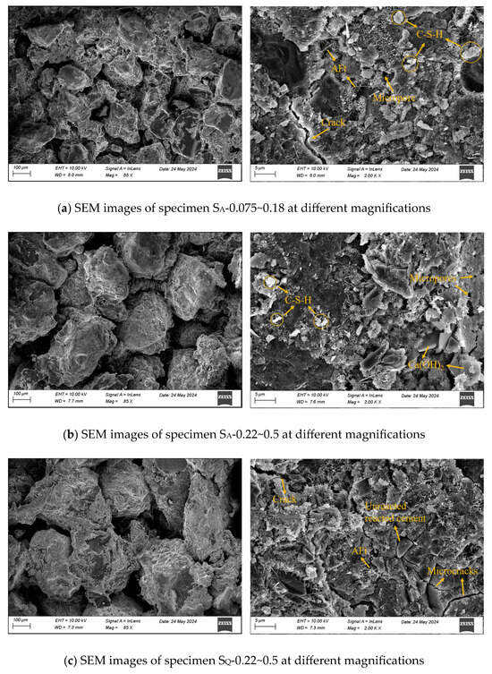 Key findings from SEM observations at 100 μm resolution (Figure 10) include: Porosity and Cementation: Specimens with identical aggregates and particle sizes prepared via the impact compaction method exhibited fewer pores and microvoids, along with enhanced inter-aggregate cementation, compared to those prepared by the static compaction method. Under static compaction, increasing aeolian sand particle size reduced inter-aggregate cementation, whereas larger particles in impact-compacted specimens improved cementation and reduced microvoids. For specimens with the same particle size but different materials, static-compacted quartz sand specimens demonstrated superior particle connectivity compared to aeolian sand counterparts, which exhibited looser packing. This difference diminished in impact-compacted specimens. Microscale Analysis (5 μm): Aeolian sand-based specimens exhibited layered calcium hydroxide (CH), needle-like ettringite (AFt), and flocculent calcium silicate hydrate (C-S-H gel). Static-compacted specimens (Figure 10a,b) displayed loose structures with visible microcracks and pores, forming mechanical weak points. Impact-compacted specimens (Figure 10d,e) showed denser material interfaces and enhanced structural integrity.