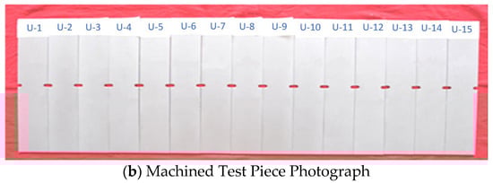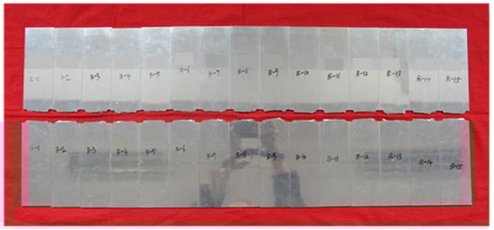 Three groups of 2060-T8 alloy test specimens were subjected to fatigue testing: unpeened specimens, specimens treated with low-intensity shot peening, and specimens treated with high-intensity shot peening. Shot peening was conducted by applying a cast steel S230 shot to one plate of each type. Each plate was cut into 15 test specimens, as shown in Figure 1, totaling 45 specimens. The specific parameters of the test specimens and the corresponding shot-peening processes are listed in Table 1.