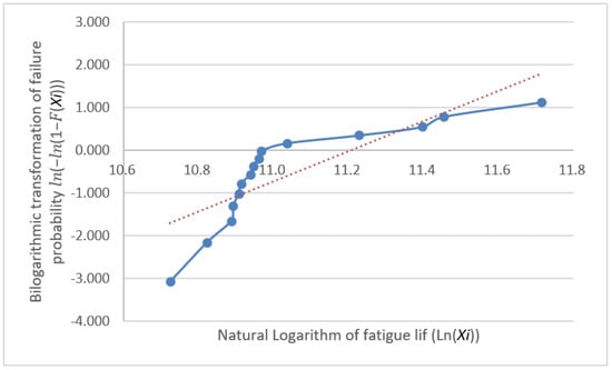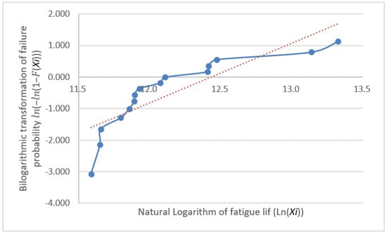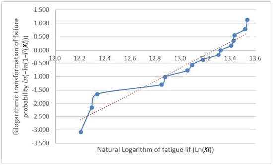 The fatigue life distribution for a group of specimens has been the focus of engineering research and is generally held to follow either a log-normal or Weibull distribution [12]. These distribution models are highly applicable to fatigue life data, as they effectively reflect the randomness and dispersion of data [13]. However, many classical statistical analysis techniques, such as hypothesis testing, analysis of variance, and regression analysis, require the analyzed data to follow a normal distribution [14] because it possesses favorable mathematical properties that simplify the calculation process and provide more reliable results for statistical inference. Thus, normality testing is not only a fundamental step in statistical analysis but also a crucial factor in ensuring the reliability and validity of the obtained results. Furthermore, it provides a rational basis for the selection of statistical models for fatigue life data analysis, enabling a more accurate assessment of fatigue performance and offering scientific support for engineering design and reliability evaluations. Subsequently, we conduct distributional verification procedures on the fatigue test dataset through separate Weibull distribution analysis and normality assessment. The analytical workflow initiates with a Weibull distribution compliance verification, employing probability plot-based graphical verification through the systematic implementation of Benard’s median rank method and linearized coordinate transformation, thereby enabling visual diagnostics of distributional adherence. First, the obtained fatigue life values were arranged in ascending order, that is ; next, the cumulative distribution function for each specimen was calculated, where ; then, the bilinear coordinates ) were plotted with a trend line. If these points are scattered along or near a straight line, the sample can be considered to follow a Weibull distribution. The plotted coordinates for the data in Table 2 are shown with their fitting lines in Figure 4, Figure 5 and Figure 6.