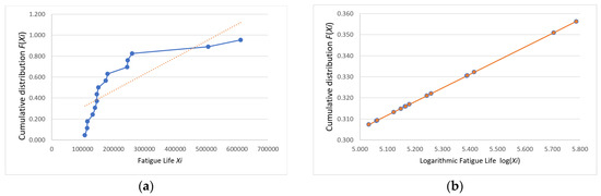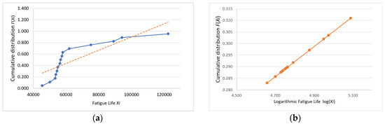 Following the Weibull distribution conformity assessment, the analytical workflow proceeds to a normality verification phase. The probability paper plotting method was applied to conduct normality testing on the fatigue life data collected in this study as follows: first, the obtained fatigue life values were arranged in ascending order, that is ; next, the cumulative distribution function for each specimen was calculated, where ; finally, the points were plotted on normal probability paper. If these points are scattered along or near a straight line, the sample can be considered to follow a normal distribution [15].