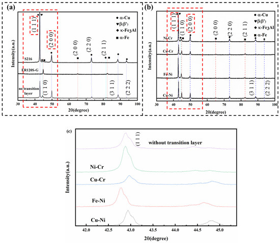 The XRD patterns of the composite metal walls revealed distinct diffraction peaks corresponding to the (111) and (200) crystal planes. During the steel/copper welding process, the diffusion of Fe elements triggers the precipitation of the β-phase and the formation of a gradient (Cu, Fe)3Al-type β′ phase, which leads to a decrease in the intensity of the (111) diffraction peak compared with S216 aluminum bronze. As illustrated in Figure 2c, a comparison of diffraction intensities among specimens with different transition layers showed that the (111) peak intensity in specimens with Ni-Cr and Fe-Ni transition layers was substantially higher than in those without any transition layer.