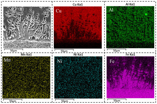 In this region, the Cu element existed predominantly as a copper-rich matrix, while the aggregated structure at the interface consisted mainly of Fe with a small amount of Al. It can be inferred that the iron-rich phase at the interface was composed of FexAl dendrites. Given that high-strength steel has a higher solidification point than aluminum bronze, the high-strength steel cladding solidified before the aluminum bronze. During solidification, iron-rich columnar dendrites form and grow along the deposition direction of the AM process into the molten aluminum bronze under the influence of temperature gradients. Simultaneously, driven by the chemical potential gradient between the aluminum bronze matrix and the high-strength steel matrix, Al diffuses intensely from the aluminum bronze matrix into the iron-rich columnar dendritic regions, leading to the enrichment of Al in these areas.