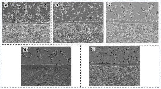 Figure 4a illustrates the bonding interface without the transition layer. A significant population of dendritic Fe-rich phases was observed at the interface region, with analogous dendritic Fe-rich phases also detected within the aluminum bronze matrix. As shown in Figure 5a, the elemental interdiffusion was generally restricted, with mutual diffusion between Fe and Cu occurring predominantly at the interface regions. Figure 4b illustrates the bonding interface after the application of a Cu-Ni transition layer. The fusion line between the steel and the transition layer appeared smooth and straight, with a reduced iron-rich phase at the interface. As shown in Figure 5b, the iron (Fe) content gradually decreased, while the copper (Cu) and nickel (Ni) contents increased progressively. This trend corresponded to the composition of the transition layer filler material (Cu-Ni welding wire), with negligible diffusion between Fe and Cu at the interface. Figure 4c displays the bonding interface after filling with an Fe-Ni transition layer. The iron-rich phase at the interface was present in the form of dendritic crystals. As observed in Figure 5c, the elemental distribution at the interface showed abrupt changes, indicating that the transition layer consisted primarily of Fe-Ni compounds. With increasing diffusion distance, the diffusion of Cu into the low-alloy steel substrate decreased sharply, reducing the likelihood of penetration cracks on the steel side. Figure 4d shows the bonding interface after filling with a Cu-Cr transition layer, where the transition layer remained dominated by a copper-rich matrix and iron-rich phases. As observed in Figure 5d, elemental diffusion was essentially absent at the interface, with the population of Fe-rich phases in these regions remaining relatively sparse. Figure 4e presents the bonding interface with an Ni-Cr transition layer. A distinct steel melting zone is observed at the fusion line. As shown in Figure 5e, alternating variations of Fe and Cu elements were detected at the interface. In conclusion, all four transition materials (Cu-Ni, Fe-Ni, Cu-Cr, and Ni-Cr) achieved excellent metallurgical bonding with low-alloy steel. After the transition layer was added, the fusion line at the interface became smooth and straight. In the absence of the transition layer, mutual diffusion of Cu and Fe elements occurs at the interface. However, with the transition layer, the interdiffusion of Cu and Fe at the interface is significantly reduced, which helps prevent the formation of penetration cracks. On the aluminum bronze side, fluctuations in copper content were observed as the scanning path traversed iron-rich phases on the copper side, with decreases in copper content consistently accompanied by increases in iron content. This phenomenon was particularly noticeable in the Ni-Cr transition layer specimen, where numerous fine iron-rich κⅡ phases were dispersed near the copper-side interface, further corroborating the line scanning results.