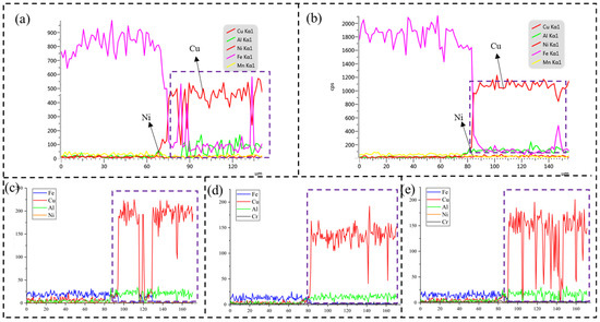 EDS line scanning: (a) without transition layer, (b) Cu-Ni, (c) Fe-Ni, (d) Cu-Cr, (e) Ni-Cr.