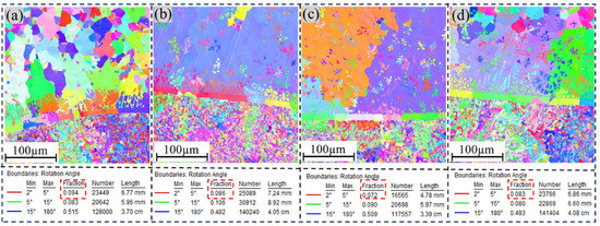 An in-depth analysis of grain orientation at the interface between the transition layer and aluminum bronze was performed using electron backscatter diffraction (EBSD) technology. As shown in Figure 6, the study revealed that the interfacial region consisted primarily of a Cu-rich matrix (α-Cu grains) and columnar Fe-rich grains formed through diffusion. At the interface, the copper layer exhibited relatively smaller grain sizes, which could be attributed to the high thermal conductivity of the initial copper layers (layer1 and layer2). This enhanced thermal conductivity significantly increased the cooling rate of the molten pool, promoting grain refinement. However, along the build direction, the copper layer demonstrated a gradual coarsening of grain sizes. This phenomenon arose from the significantly lower thermal conductivity of the underlying steel substrate compared with the copper layer. As the number of deposited layers increased, the cooling rate decreased, leading to grain coarsening. Concurrently, Fe grains near the interface exhibited a columnar morphology, with their size and density progressively decreasing as the distance from the interface increased. At the interface, low-angle grain boundaries (LAGBs) dominated the structure. In the Cu-Ni specimen, the proportion of LAGBs was measured to reach 9.4%. The Cu-Cr specimen exhibited a higher proportion of LAGBs than the other specimens. This suggests that the addition of Ni contributed to grain refinement at the interface. The increased proportion of LAGBs, characterized by lower energy and stronger bonding capacity, positively contributed to enhancing the plasticity and toughness of the material.