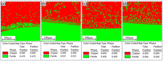 As shown in Figure 7, a comparative analysis of the phase distribution diagrams for different transition-layer samples revealed notable variations in both the content and distribution of the iron-rich phase. Specifically, the sample with a Cu-Cr transition layer contained only 40% iron-rich phase, which was uniformly distributed within the Cu matrix. In contrast, the sample with a Ni-Cr transition layer exhibited a significantly higher proportion of 54.6% iron-rich phase. This discrepancy can likely be attributed to the increased inhibitory effect of the Cu-Cr intermediate layer on the diffusion of iron (Fe) elements. Additionally, in the Cu-Ni sample, the iron-rich phase was located primarily at the interface between the two metals, with a small and uniform size observed in regions away from the boundary.
