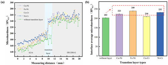 (a) Results of microhardness test; (b) interface average microhardness.