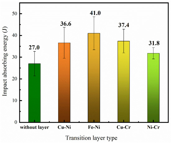 As shown in Figure 10, the impact-absorbed energy of the four groups of thin-walled specimens with transition layers was improved compared with the specimen without a transition layer, indicating enhanced interfacial bonding strength between the steel and copper after the addition of transition layers. Among these, the specimen with the Fe-Ni transition layer showed the most significant improvement, with an increase of 14 J, while the Ni-Cr transition layer specimen exhibited the smallest enhancement, with an increase of only 4.8 J in impact-absorbed energy. This difference may be attributed to the higher concentration of the β′ phase in the interfacial region of the Ni-Cr transition layer specimen. Although the β′ phase has high hardness, its lower ductility and toughness may have contributed to the reduced overall impact toughness of the specimen.
