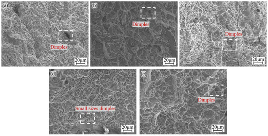 Overall, Figure 11 shows that dimples were present in the fracture morphology of all five groups of specimens, along with “quasicleavage” facets and tear ridges, indicating quasicleavage fracture characteristics. As shown in Figure 11c, the Fe-Ni transition layer specimen exhibited larger, deeper, and more uniformly distributed dimples than the other three groups of specimens, resulting in higher impact absorption energy. In contrast, the Cu-Ni, Cu-Cr, and Ni-Cr transition layer specimens showed relatively fewer and smaller dimples, leading to weaker impact absorption energy and lower impact toughness. In conclusion, the Fe-Ni transition layer specimen demonstrated the highest impact absorption energy, which further supports the results of the impact tests.