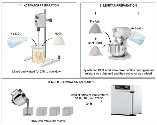 Compressive strength tests on the produced GPM samples were carried out using 50 mm × 50 mm × 50 mm cubic samples in accordance with TS EN 196-1 [41] and TS EN 12390-3 [42] and using a 0.6 MPa/s loading rate.