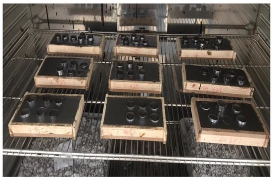 Cubic GPM samples of 50 mm × 50 mm × 50 mm size for uniaxial compressive strength tests and cylindrical GPM samples with 20 mm diameter and 5 mm thickness for antimicrobial tests were prepared. All samples were cured in an oven at different temperatures (60, 80, 100 and 120 °C) for 24 h for the strength development of mortars. Curing temperature is an important parameter in the strength properties of geopolymer mortars. Since the strength development and antimicrobial performance properties of geopolymer mortars was to be investigated, curing at different temperature values was also added to the study as a parameter to evaluate these properties. After the curing process in the oven, the samples were removed from the molds and allowed to cool to room temperature before being subjected to the strength and antimicrobial tests. The GPM production procedure is schematized in Figure 2. The prepared cylindrical samples for antimicrobial activity tests are shown in Figure 3.