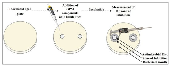 The agar diffusion method described by Li et al. was used against four bacteria and one fungus to determine the antimicrobial activity of GPMs cured at different temperatures (60, 80, 100 and 120 °C) [43]. First, each side of the GPM sample was UV sterilized for at least 1 h. Additionally, 0.5 McFarland bacterial suspensions were prepared in PBS and 2 McFarland fungi suspension was prepared in 0.5% Tween + PBS from fresh cultures. A volume of 100 μL of bacterial and fungal suspensions were spread on NA and PDA, respectively. GPM samples (approx. 20 mm diameter) were placed onto inoculated agar and placed into an incubator. Moreover, the components of the geopolymer and their mixtures, which are sodium SMS, SMS + NaOH mixture, FA and a mixture of all (SMS + NaOH + FA) were loaded onto a blank disc (approx. 20 μL for liquid and 10 µg for solid components) and placed onto inoculated mediums. The inoculated plates were incubated for 24 h for bacteria at (35 ± 1) °C and 72 h for fungus at (28 ± 1) °C. The antimicrobial activities were evaluated by measuring the clear zone around GPM samples. Results are expressed as the inhibition diameters (mm). A schematic illustration of the antimicrobial activity test is given in Figure 4.