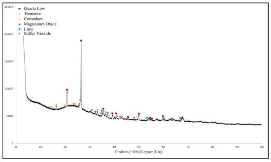 The XRF and XRD (X-Ray Diffractometer (Malvern Panalytical, Almelo, The Netherlands, Empyrean XRD)) results are given in Table 5 and Figure 5, respectively. As seen in Table 5, the sum of SiO2 + Al2O3 + Fe2O3 was 87.83% and the CaO ratio was 4.95% (<10%). According to ASTM C 618 [44], the FA used in this study is a low-lime FA and can be classified as F type. Quartz being found as a major component in XRD analyses confirms the XRF results.
