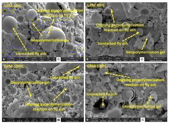 - The microstructural images obtained from SEM showed that more compact gel formations occurred in GPM samples produced at higher temperatures and the amount of unreacted fly ash was relatively smaller with respect to lower temperatures. Although geopolymerization was directly related to curing temperature, some structural cracks were observed in mortars cured at 120 °C. This implies that the high temperature damages the internal structure of the GPMs. The change in compressive strength results also support this result.