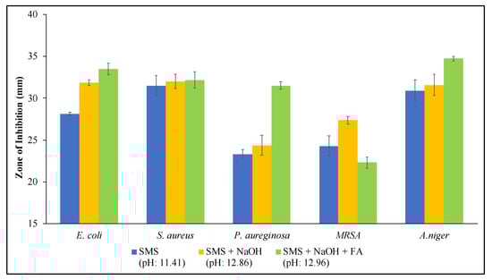 In order to determine the underlying reason for the antimicrobial behavior of the produced geopolymer mortars, the activities of all components used in the production of GPM were determined. The disc diffusion results obtained from geopolymer components and their mixtures are given in Figure 10 and Figure 11. According to the obtained results, SMS was the most active component, which has already been demonstrated in previous studies presented by Weber et al. and Basak et al. [61,62]. In addition, NaOH addition into SMS results in an increase in antimicrobial activity. It is known that microorganisms struggle to survive in highly alkaline environments due to the negative effects on their cellular components and metabolism (unless they are alkaliphiles). The reason for the increased antimicrobial activity is most likely related to the increased alkalinity of the mixture. The disc diffusion results also showed that, even if the FA itself did not show antimicrobial activity, zone diameters were increased for the SMS + NaOH + FA mixture. To understand the alkaline nature of solutions, the pH values of all materials and mixtures were measured. The pH results were recorded as 11.41, 12.86 and 12.95 for SMS, SMS + NaOH and SMS + NaOH + FA, respectively. The increase in the zone of inhibition diameters may be associated with the increased alkalinity of solutions. In alkaline environments, the cell membrane integrity and metabolic processes of microorganisms are disrupted, resulting in inhibition of microorganism growth or death [63,64].