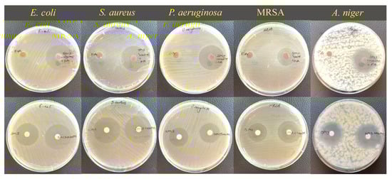 According to the agar diffusion assay, all samples showed antibacterial and antifungal activity against all the tested microorganisms (Figure 8 and Figure 9), including an antibiotic-resistant bacterium (MRSA). Although there was no dramatic difference between the antimicrobial activity of bacterial strains, the highest inhibition zones were generally obtained against Gram-negative species (E. coli and P. aeruginosa).