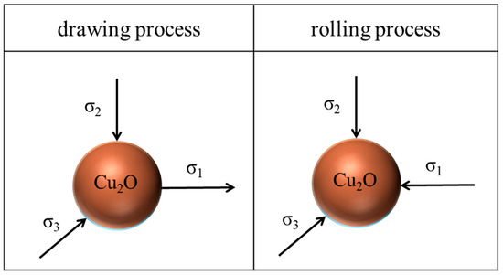 Researchers indicate that oxygen has a significant influence on the copper matrix. They report, among others, that oxygen affects the electrical conductivity, kinetics of recrystallization, and risk of hydrogen disease [5,7,8,9] or may even limit the deformability of copper due to the presence of eutectic Cu2O oxides in the copper matrix [10,11]. Cu2O oxide particles are present in the matrix throughout the whole technological process, beginning with the melting of cathodes, continuous casting and crystallization of the strand, hot-rolling to the form of the wire rod, and finally the cold-drawing process to obtain wires and microwires [12]. Mysik et al. [13] stated that Cu-Cu2O eutectic may function as the stress concentration points at the grain boundaries and, as a result, may lead to fractures at further stages of copper wire processing. Similar conclusions were presented by Zhao et al. [14], with the authors claiming that the presence of second-phase particles of Cu2O oxides resulted in the formation of microstructural defects caused by the dispersion hardening mechanism. Due to being a ceramic material, Cu2O oxide is significantly harder than copper, and its precipitates are incoherent to the matrix [15,16]. Research papers indicate that the presence of voids and/or inclusions is the most common reason of limited deformability in the wire drawing process [17,18,19,20]. Indeed, the authors in [21,22,23,24,25] claim that the vast majority of technological ruptures and breaks during the wire drawing process of copper happen as a result of inclusions, including the presence of Cu2O oxides. Therefore, it may be assumed that Cu2O oxides initiate the formation of wire ruptures and, as such, are one of the main threats to the cold-drawing process and cause of limited deformability of ETP-grade copper. Research results presented by Zasadzińska and Knych [26] proved that Cu2O oxides fragmentated only during the initial stages of the diameter reduction in ETP-grade copper wire rod. The oxides were reduced from the original size of up to 5 µm to below 1 µm. However, further fragmentation did not occur regardless of the applied deformation. When considering the cold-rolling process, analyses of Cu2O oxides’ evolution were conducted only regarding thick plates and sheets [14,27], whereas no research was performed on thin strips and foils. The way Cu2O oxide particles behave might be entirely different due to the fact that drawing and rolling processes have significantly different states of stress [28,29]. Both are triaxial, but in terms of the drawing process, the state of stress is biaxial compression with dominating uniaxial tension, while in the rolling process it is triaxial compression. Figure 1 presents a schematic representation of the stress components affecting Cu2O oxide in the plastic zone of the drawing die and the rolling process.