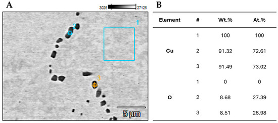 EDS analysis of ETP-grade copper material: (A) microstructure with selected points and area; and (B) chemical composition in the corresponding points and area.