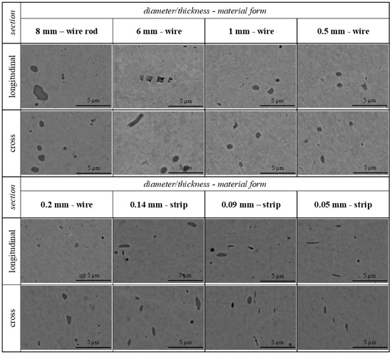 The wire drawing process was performed down to the diameter of 0.2 mm, and these wires were further subjected to cold-rolling. The extreme deformation and different states of stress prevailing inside the roll gap influenced the shape and size of the Cu2O oxide particles. Existing inclusions were characterized by an elongated and distorted shape in comparison to the particles observable after only the wire drawing process. However, no further fragmentation of Cu2O oxides was observed. Exemplary images of the evolution and morphology of Cu2O oxides throughout the wire drawing and rolling processes of ETP-grade copper are presented in Figure 4.