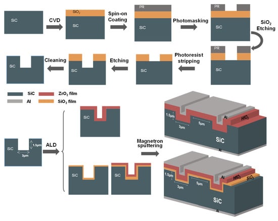 The sample preparation process of the films and a scheme of the final product are depicted in Figure 1. The experiment commenced with a 4H-SiC epitaxial wafer (n-doped, (0001) orientation with 4° off-axis) as the substrate. A 2.5 µm-thick SiO2 masking layer was initially grown via chemical vapor deposition (CVD, SINO-Plasma 8000, amteglobal, Wuxi, China). Next, photolithography (ABM/6/350/NUV/DCCD/M, ABM Inc., San Jose, CA, USA) was employed to pattern the mask, defining trench arrays with 3 µm width. Following SiO2 layer patterning through dry etching, the residual photoresist was stripped via solvent treatment, enabling subsequent reactive ion etching of the SiC substrate to define trench architectures. The finalized structures exhibited precise dimensional control with trench widths of 3 µm, vertical depths of 1.5 µm, and inter-trench spacing of 5 µm. To ensure mask integrity, buffered oxide etch (BOE) was selectively applied to remove residual oxides from unpatterned regions.