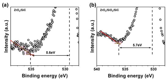 O 1s energy loss spectrum for fitting the band gap of (a) ZrO2 and (b) SiO2/ZrO2.