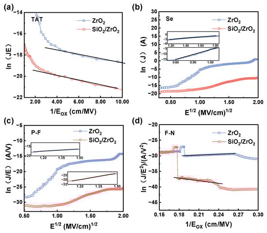 Electric fields of ZrO2 and SiO2/ZrO2 dielectric MOS capacitors for (a) TAT, (b) Schottky emission, (c) F-N emission, and (d) F-N tunneling model fitting plots.