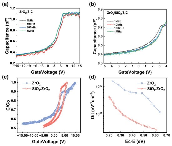As shown in Figure 9d, the Dit values calculated at EC-0.2 eV by the high–low frequency method were estimated to be 1.58 × 1012 eV−1·cm−2 for ZrO2 and 4.19 × 1011 eV−1·cm−2 for the SiO2/ZrO2 stack [45]. Thus, both gate dielectric samples contained certain defects, aligning with the TAT mechanism observed under moderate electric fields. The lower Dit value of the SiO2/ZrO2 can be attributed to the passivation effect of the SiO2 interlayer [46]. Material characterization via XPS and SE previously demonstrated that SiO2 forms a stable, uniform interface layer with reduced oxygen vacancy density, which correlates directly with the measured improvement in Dit. On the other hand, the SiO2 interlayer serves as a buffer, alleviating the lattice mismatch between ZrO2 and the SiC substrate. In the stacked structure, the buffering effect of the SiO2 layer isolated ZrO2 from direct contact with SiC, mitigating the impact of oxygen vacancies on Dit.