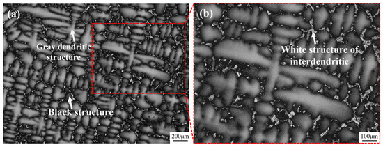 Figure 1 shows the as-cast microstructure of Ta-GH4151 alloy. In this microstructure, the gray dendritic structure is the dendritic arm region, the black structure between the dendrites arm is the interdendritic region, and the white structure in the interdendritic region is the secondary phase structure of solidification segregation. The average value of secondary dendrite arm spacing (SDAS) was 61.34 μm as determined by quantitative analysis of SDAS using Image J (v1.8.0.345) software. Li et al. [12] showed that the average SDAS of ∅120 mm as-cast GH4151 alloy was 35.48 μm, while the average SDAS of ∅240 mm as-cast GH4151 alloy was 73.66 ± 5.3 μm. The increase in SDAS is related to the aggravation of element segregation in the alloy [21]. However, SDAS is also significantly affected by the cooling rate. Therefore, it may not be accurate enough to evaluate the degree of segregation only by the SDAS value. To comprehensively understand the segregation of the alloy, it is necessary to analyze the composition of the dendritic structure.