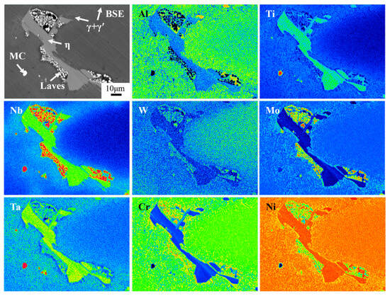 During the solidification process, the redistribution of solute elements at the solid-liquid interface leads to differences in the composition of the dendritic arm and interdendritic regions [22,23]. Figure 2 illustrates the elemental distribution of the as-cast structure of the Ta-GH4151 alloy, from which the segregation coefficients (k) for each element were calculated. The k is defined as the ratio of the average element content in the dendrite arm region to that in the interdendritic region [24]. As illustrated in Figure 2a–i, the distribution of Ni, Al, and Cr elements in the alloy is relatively uniform. The segregation coefficient values of kNb, kAl and kCr are close to 1, indicating that there is no significant difference in the distribution of these elements in the dendrite arm and interdendritic regions. Conversely, Ti, Ta, Nb, and Mo elements show negative segregation characteristics (k < 1), mainly enriched in the interdendritic region. The Nb element’s segregation is significantly higher than that of Ti, Ta, and Mo. The segregation coefficient of Nb in Ta-GH4151 alloy is kNb = 0.19, which is much lower than that in GH4151 alloy (kNb = 0.4) [10]. The elements Cr and W show positive segregation (k > 1) and are mainly enriched in the dendritic arm region, where the segregation tendency of W is particularly significant. The segregation coefficient of W in Ta-GH4151 alloy is kW = 2.34, which is much lower than that in GH4151 alloy (kW = 1.94) [10]. These findings indicate that the addition of Ta significantly enhances the segregation of elements in Ta-GH4151 alloy, which may have an important influence on the microstructure and macroscopic properties of the alloy.