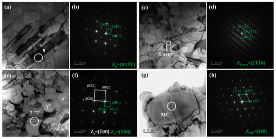 Microstructure of as-cast Ta-GH4151 alloy by TEM: (a) BF of η phase; (b) SAED corresponding to the white circular region in (a); (c) BF of Laves phase; (d) SAED corresponding to the white circular region in (c); (e) BF of eutectic (γ + γ′); (f) SAED corresponding to the white circular region in (e); (g) BF of MC; (h) SAED corresponding to the white circular region in (g).