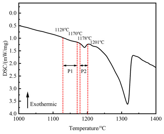 Homogenization is an effective method of eliminating elemental segregation and secondary precipitation phases in alloys and improving hot workability [29]. In order to prevent the rapid dissolution of secondary precipitated phases at high temperatures from producing caverns, it is crucial to determine their initial dissolution temperature. Figure 5 presents the DSC analysis results of the as-cast Ta-GH4151 alloy. Two obvious endothermic peaks were observed during the heating process. The temperature range of the P1 peak is wide. The initial redissolution temperature is 1128 °C, and the final re-dissolution temperature is 1178 °C. Therefore, it can be considered that the P1 peak is the superimposed endothermic peak of the eutectic (γ + γ′) and the Laves phase. The P2 peak has an initial dissolution temperature of 1178 °C and a final dissolution temperature of 1201 °C. It is inferred that the P2 peak corresponds to the re-dissolution endothermic peak of the η phase.