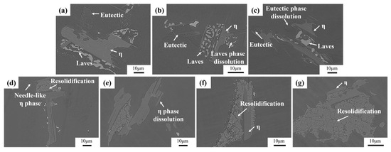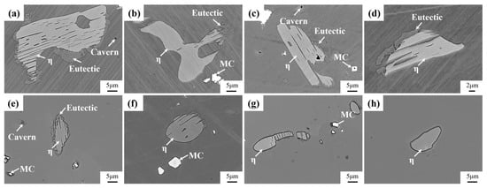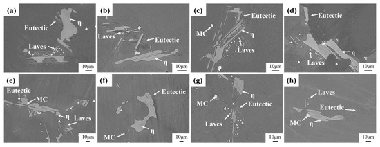 High-alloyed superalloys typically undergo a staged homogenization strategy to target the elimination of secondary precipitated phases [30]. Figure 7 shows the evolution of secondary precipitation phases of homogenized Ta-GH4151 alloy at 1140 °C and 1160 °C. During homogenization at 1140 °C, the Laves phase gradually dissolves with increasing holding time. The eutectic (γ + γ′) slowly dissolves at 1160 °C. The η phase does not exhibit significant dissolution behavior under both homogenization treatment conditions at 1140 °C and 1160 °C.