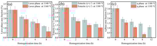 Area fraction of residual (a) Laves phase, (b) eutectic (γ + γ′) and (c) η phase with the change in holding time during specific steps.