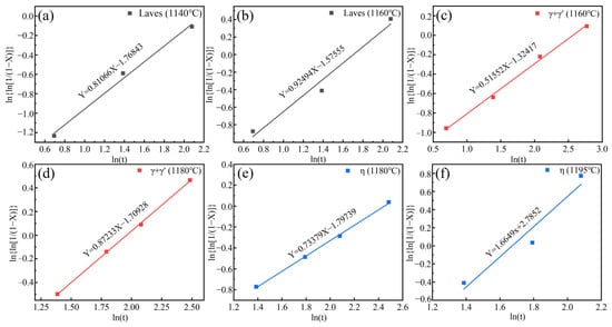 Avrami plots for dissolution of precipitated phase at different temperatures (a,b) Laves phase, (c,d) eutectic (γ + γ′), (e,f) η phase.