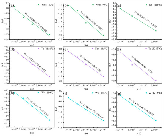 Linear relationship between lnδ vs. t for (a) Nb at 1180 °C, (b) Nb at 1195 °C, (c) Nb at 1215 °C, (d) Ta at 1180 °C, (e) Ta at 1195 °C, (f) Ta at 1215 °C, (h) W at 1180 °C, (i) W at 1195 °C, (g) W at 1215 °C.