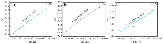 The linear relationship between lnD vs. (−1/RT) for (a) Nb, (b) Ta, (c) W.