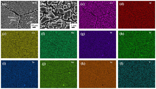Microscopic structure by SEM (a,b) and Dendritic structure by EDS (c–l) of homogenization Ta-GH4151 alloy. (Where (a,b) are with a magnification of 1000× and 10,000× respectively).