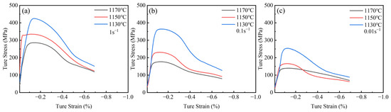True stress-true strain curves for (a) strain rate of 1 s−1, (b) strain rate of 0.1 s−1 and (c) strain rate of 0.01 s−1 hot compressed Ta-GH4151 alloy under different temperatures.