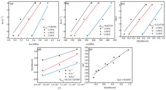 As shown in Figure 15, the hot compression parameters of Ta-GH4151 alloy were obtained by linear fitting of hot compression data: α = 0.00386, n′ = 7.09795, β = 0.02739, n = 5.315776, b = 388,333.7251067, lnA = 139.8973. The thermal activation energy of homogenized Ta-GH4151 alloy is Q′Ta-GH4151 = 1694.173 kJ/mol. Therefore, the thermal compression constitutive equation of Ta-GH4151 alloy can be expressed as:
